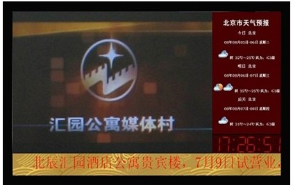 北辰匯園酒店公寓貴賓樓屬于北辰集團奧運配套酒店,信息發(fā)布系統(tǒng)主要分布在各電梯廳和大堂位置,發(fā)布酒店形象宣傳、電視直播、天氣預報等。
