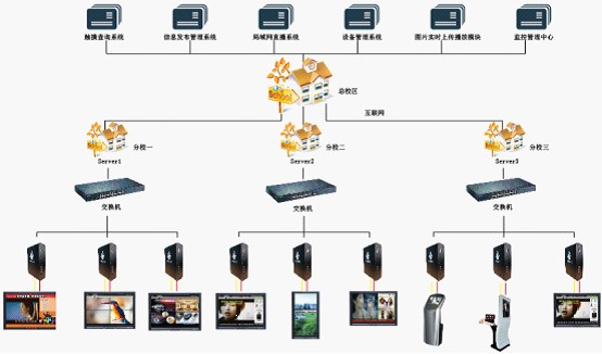 全面分析現(xiàn)有條件,使本系統(tǒng)充分滿足實(shí)際應(yīng)用需要;不但可以播放學(xué)校各樓層信息、緊急通知還可以對正在進(jìn)行的活動進(jìn)行直播; 采用開放式結(jié)構(gòu),方便地實(shí)現(xiàn)進(jìn)一步的升級以適應(yīng)未來的需求擴(kuò)展;
