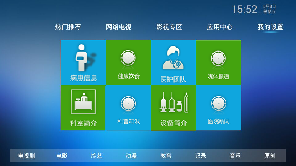 在醫(yī)院病房的電視終端上,平臺系統(tǒng)除可提供廣電有線電視信號、醫(yī)院自辦頻道電視信號點(diǎn)播外,還可以滿足住院病人對于醫(yī)院公共信息、新聞公告、專家信息、個(gè)人病歷/檢查報(bào)告/治療費(fèi)用、點(diǎn)餐、購物等各項(xiàng)信息的分析查詢,在系統(tǒng)授權(quán)下,也可觀看部分相關(guān)音視頻資料。
