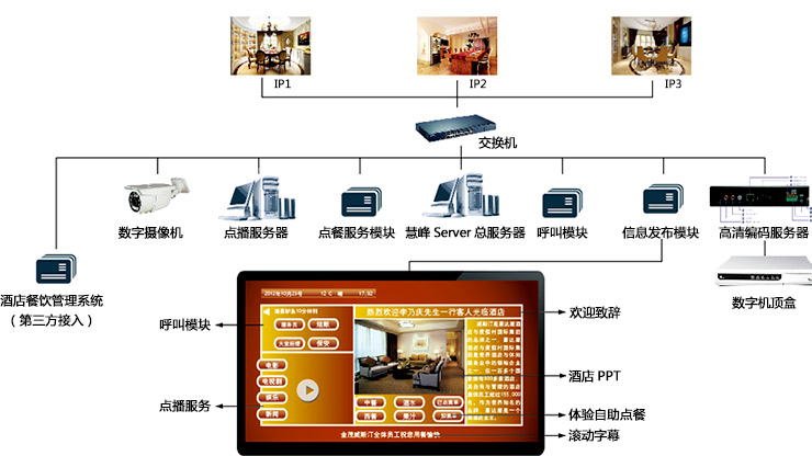 酒店現(xiàn)在具備的功能設(shè)施越來越豐富,包含餐飲、住宿、會展、慶典活動、會議、健身、環(huán)境體驗(yàn)等等,而酒店功能區(qū)包括大堂、購物商場、休息等候區(qū)、豪華包廂、會議廳、宴請廳、健身廳等等,而“信息交互與發(fā)布系統(tǒng)”的目的,就是讓顧客從進(jìn)入酒店的那一刻起,就可以享受到完美的信息化服務(wù),并帶給顧客智能、便捷、高檔次的享受與體驗(yàn)。根據(jù)賓館酒店實(shí)際應(yīng)用情況,我們建議在大堂、會議室門口、電梯間、貴賓廳、包房等區(qū)域進(jìn)行液晶信息展示和指示。